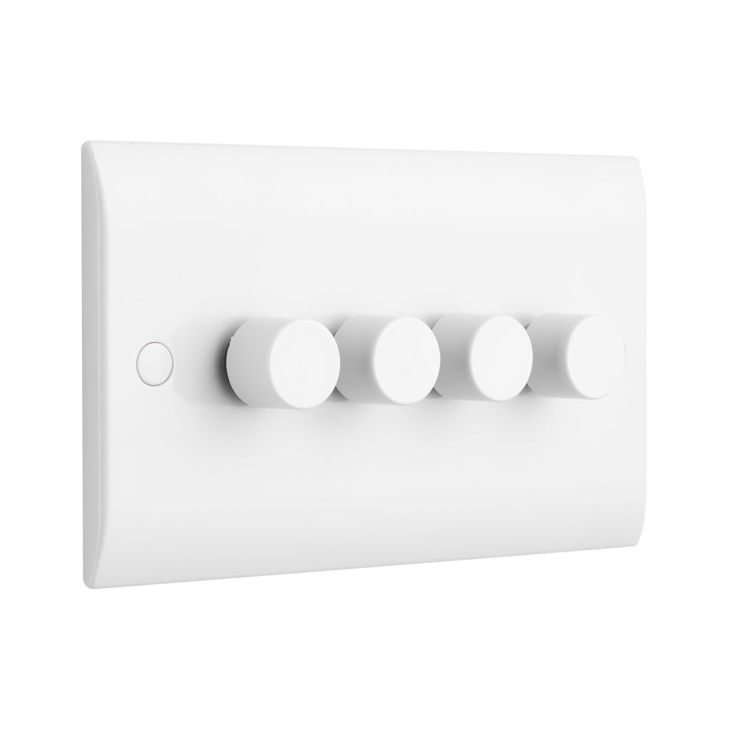 - 5-100W LED Dimmer The dimmer module we use is universal, making it the ideal choice for LED, halogen, CFL and incandescent lamps Supplied with fixing screws & white screw covers for sleek appearance 2 way push on/off with rotary control This has been manufactured using high grade thermoset Urea which effectively inhibits the growth of infectious diseases, including MRSA, E-Coli, Salmonella and Klebsiella Pneumonia bacteria We recommend a minimum mounting box depth of 25mm Certified to IEC/BS EN60669