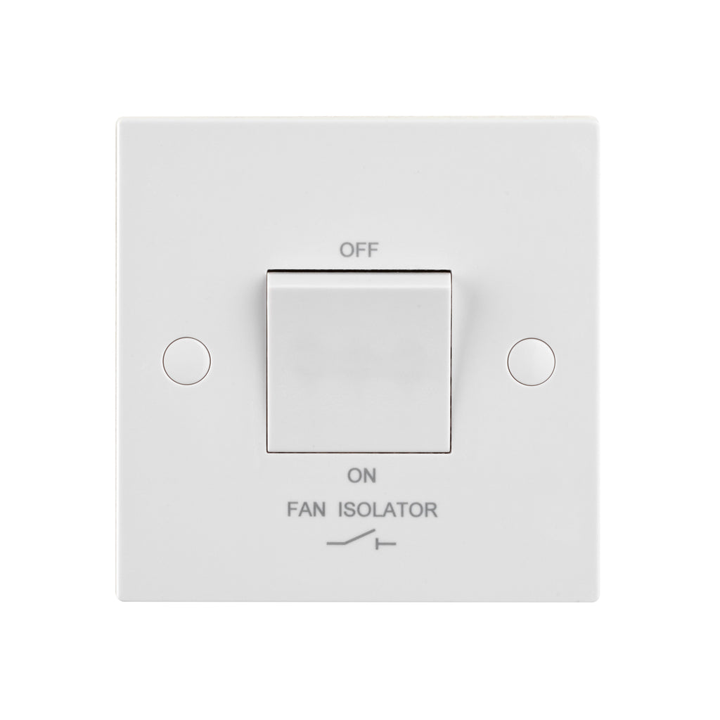 - Our 10AX rated switch boasts captive screws which provide for quick, easy and hassle free installation Supplied with fixing screws & white screw covers for sleek appearance The Fan Isolator switch has a triple pole switching design This has been manufactured using high grade thermoset Urea which effectively inhibits the growth of infectious diseases, including MRSA, E-Coli, Salmonella and Klebsiella Pneumonia bacteria We recommend a minimum mounting box depth of 25mm Certified to IEC/BS EN60669
