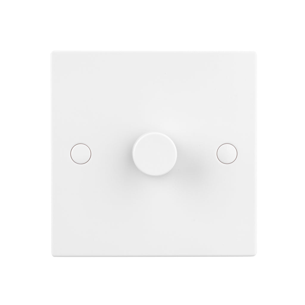 - 5-100W LED Dimmer The dimmer module we use is universal, making it the ideal choice for LED, halogen, CFL and incandescent lamps 2 way push on/off with rotary control Supplied with fixing screws & white screw covers for sleek appearance This has been manufactured using high grade thermoset Urea which effectively inhibits the growth of infectious diseases, including MRSA, E-Coli, Salmonella and Klebsiella Pneumonia bacteria We recommend a minimum mounting box depth of 25mm Certified to IEC/BS EN60669