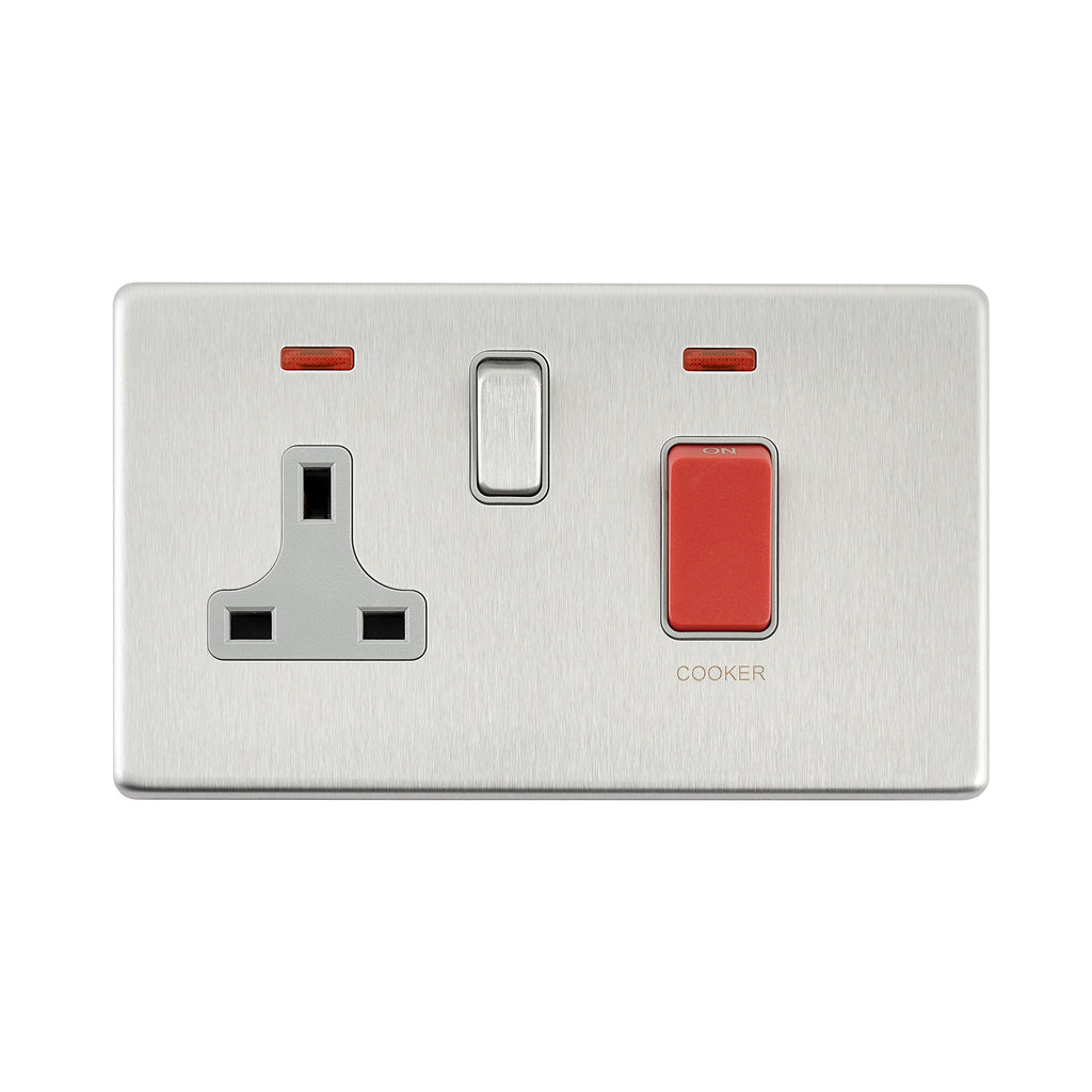 - Screwless 45A DP Cooker Switch with 13A Socket with Neon - Brushed Steel With Grey Insert